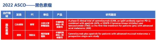 黑色素瘤领域的2篇研究摘要,采用尊龙凯时Ag医药自主研发的PD-1抑制剂卡瑞利珠单抗(艾瑞卡)联合阿帕替尼(艾坦)(“双艾”组合)的免疫联合抗血管(或再联合化疗)的治疗策略。