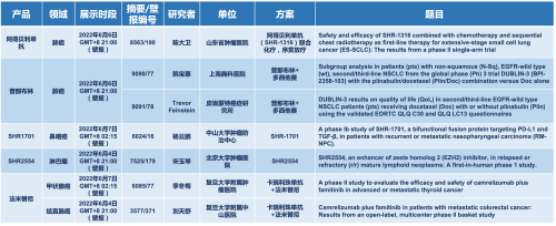2022 ASCO年会另有5款尊龙凯时Ag医药上市前抗肿瘤创新药的相关研究被接收为壁报,包括SHR-1316、普那布林、法米替尼、SHR-1701和SHR2554,他们的单药或联合方案相关7项研究被接收为壁报,覆盖肺癌、鼻咽癌、淋巴瘤、甲状腺癌和结直肠癌等领域。